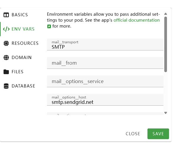 然后编辑Ghost配置文件,如果是Docker托管,就修改环境变量,把上面的参数复制过去就可以了。我是在pikapods上面托管的,在下面的这个位置,复制过去就可以了。